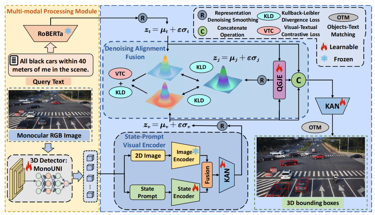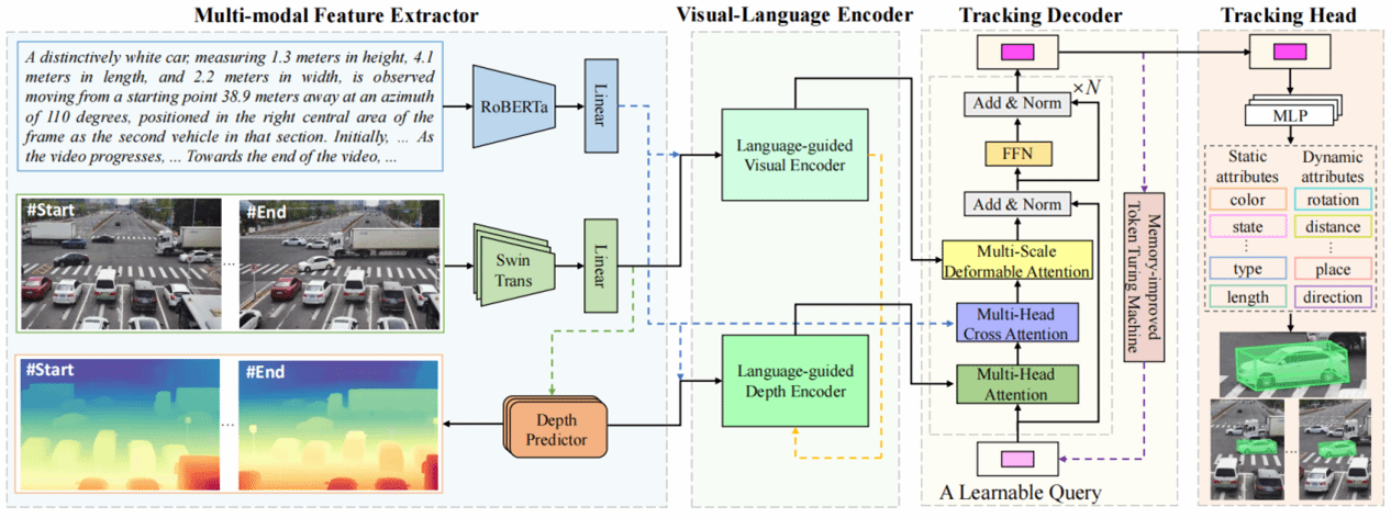 该研究首创单目视频三维视觉语言跟踪(Mono3DVLT)研究,突破传统技术依赖昂贵传感器及语言融合不足的局限。团队提出三大创新:定义单目视频三维视觉语言跟踪任务范式;构建首个大规模数据集Mono3DVLT-V2X,融合大模型生成与人工标注,提供79,158段含2D/3D标注的自然语言视频;开发多模态架构模型Mono3DVLT-MT,其创新设计的特征提取与融合机制在自建数据集上建立性能新基准,显著超越现有方法,为三维视觉语言跟踪领域提供突破性解决方案。